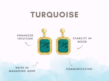 Add a pop of colour with these 22kt gold plated Turquoise drop earrings that fuse ancient wisdom with modern aesthetics. It boosts relationships by bringing stability and harmony and is believed to be a great stone for couples signifying enduring love. The rectangular shaped drop earrings are vibrant with blue green hues, impart healing benefits and soothing energies. Make a fashion statement while using the pair as a mindful accessory by tapping into metaphysical and physical benefits of Turquoise.